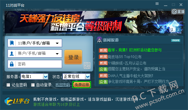首先我们在本站下载安装好11对战平台软件后,我们可以先注册账号,进入到登录界面,如果之前有账号可以直接登录,如果没有可以点击免费注册选项,然后进行注册,注册成功后就可以输入账号密码,然后在下方选择服务器,目前11对战平台支持电信、网通、教育网登录。选择完成后点击登录进就可以进入软件主界面进行使用了。