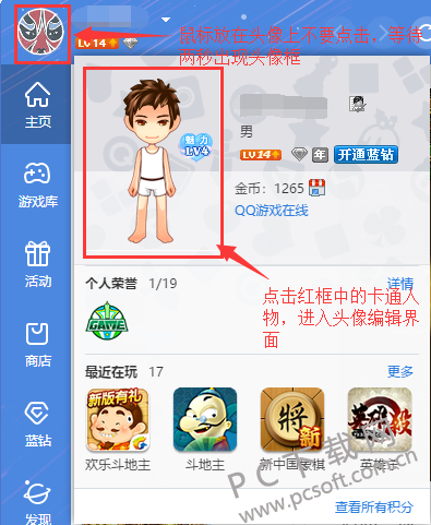 1、首先打开qq游戏大厅的主界面,然后把鼠标放到左上角头像的位置几秒钟,会出现如下图所示信息介绍界面,然后点击人物。