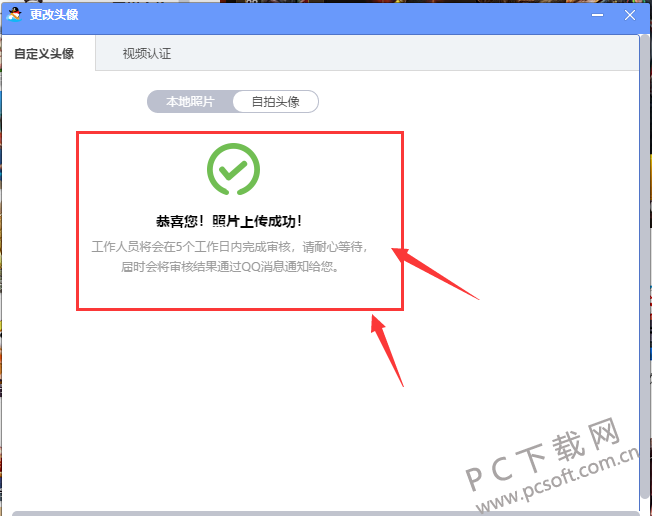 4、等待片刻就会提示上传完成,会出现下图所示的情况,等待人工审核之后就完成了更换头像。