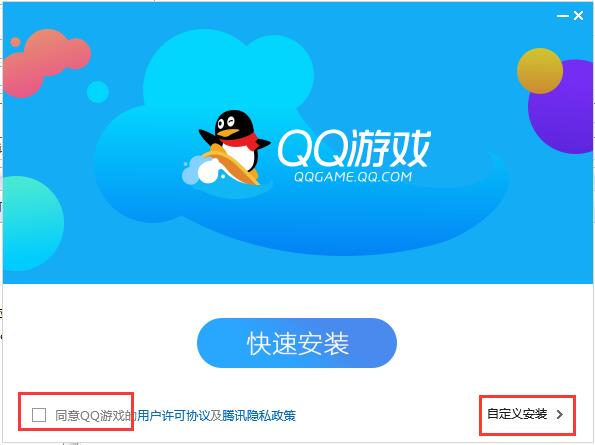 2、双击打开“QQGame11.EXE”文件,看到安装界面,首先选择左下角的“同意QQ游戏的......”打勾,然后可以点击“快速安装”选择系统默认的安装地址进行安装,也可以点击“自定义选项”自主选择安装路径,这里小编推荐自定义选项。
