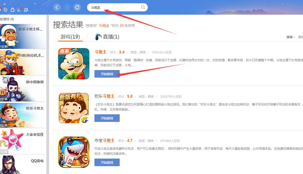 4、玩家可以在上方的搜索框中输入自己想要玩的游戏,点击搜索按钮完会出现搜索结果,找到想玩的游戏点击“开始游戏”按钮。